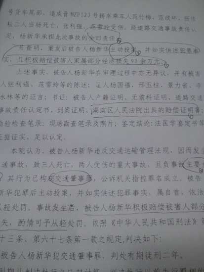 河南商報訊(記者王紅偉)一起交通肇事案三死兩傷,在被告人沒賠償?shù)那闆r下,陜縣人民法院卻以“被告人積極賠償受害人家屬部分經(jīng)濟損失90余萬元”為重要依據(jù),做出減輕處罰的判決書。