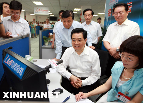 上午10時(shí),胡錦濤總書記來到人民網(wǎng)。在強(qiáng)國論壇,胡錦濤總書記聽取了論壇情況簡要介紹,隨后,興致勃勃地同網(wǎng)友們在線交流。人民網(wǎng)進(jìn)行了網(wǎng)上圖文、視頻直播。