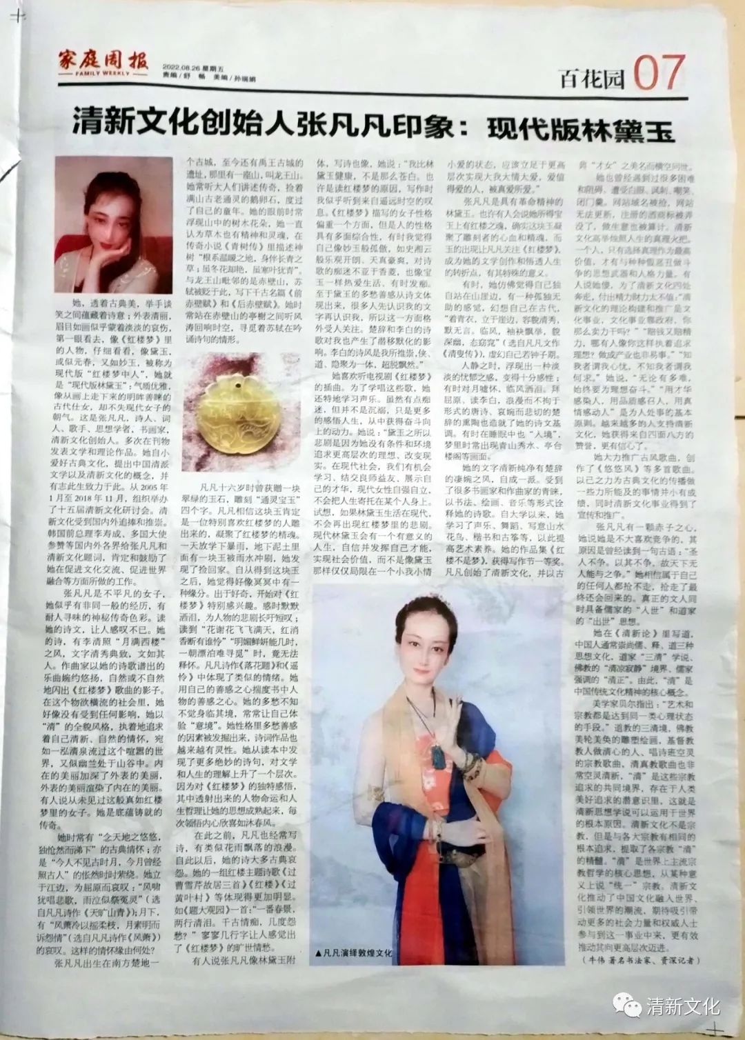 她,透著古典美,舉手談笑之間蘊(yùn)藏著詩(shī)意;外表清麗,眉目如畫(huà)似乎蒙著淡淡的哀傷,第一眼看去,像《紅樓夢(mèng)》里的人物,仔細(xì)看看,像黛玉,或似元春,又如妙玉,被稱為現(xiàn)代版“紅樓夢(mèng)中人”,她就是“現(xiàn)代版林黛玉”:氣質(zhì)優(yōu)雅,像從畫(huà)上走下來(lái)的明眸善睞的古代仕女,卻不失現(xiàn)代女子的朝氣。這是張凡凡,詩(shī)人,詞人,歌手,思想學(xué)者,書(shū)畫(huà)家,清新文化創(chuàng)始人。多次在刊物發(fā)表文學(xué)和理論作品。她自小愛(ài)好古典文化,提出中國(guó)清派文學(xué)以及清新文化的概念,并有志此生致力于此。從2005年1月至2018年11月,組織舉辦了十五屆清新文化研討會(huì)。清新文化受到國(guó)內(nèi)外追捧和推崇。韓國(guó)前總理李壽成、多國(guó)大使參贊等國(guó)內(nèi)外各界給張凡凡和清新文化題詞,肯定和鼓勵(lì)了她在促進(jìn)文化交流、促進(jìn)世界融合等方面所做的工作。